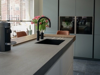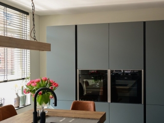 Een moderne fenix keuken met een uitgebreide lijn van NEFF keukenapparaten in Sliedrecht. Er is gekozen voor twee kleuren. Het schiereiland is in mat wit uitgevoerd en de hoge kasten met NEFF apparatuur is in verde grijs. De hoge kastenwand is van het materiaal Fenix. Fenix heeft een nanotechcoating. Deze coating zorgt ervoor dat het oppervlak erg mat is en zacht aanvoelt, geen licht reflecteert en daarbij vrijwel geen vingerafdrukken achterlaat.