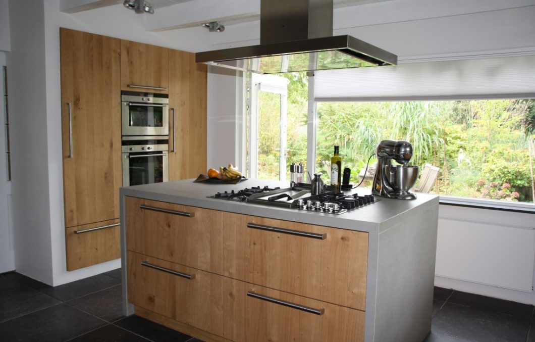 De hout gestookte haard geeft warmte en sfeer in deze gezellige familie keuken. Steeds meer komen we de gashaard of de hout gestookte haard tegen in de moderne of de landelijke keuken. De combinatie van verschillende elementen in deze keuken zorgt ervoor dat het er altijd gezellig vertoeven is.